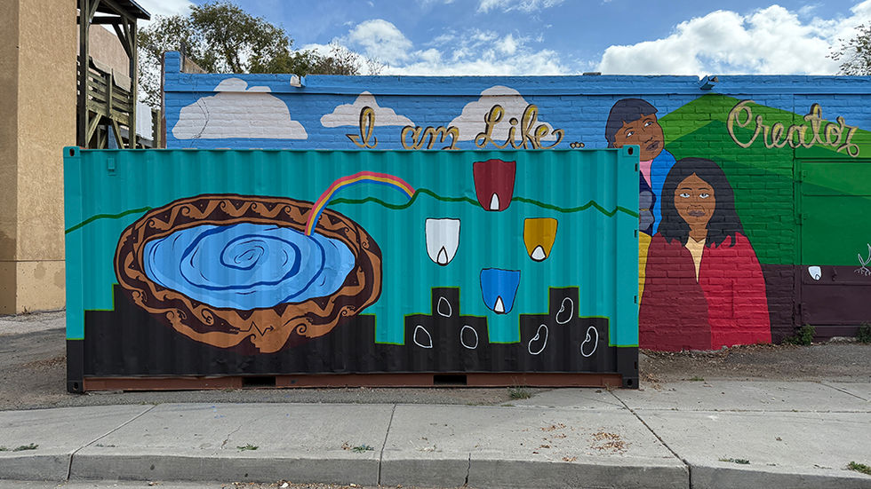 The new mural honors and prioritizes local Pueblo/Indigenous culture and values, and elucidates the differences between these and the settler colonial nuclear bomb production happening now and soon increasing in Los Alamos as well as the ever expanding nuclear industry, i.e. nuclear corridor in southeastern NM, as source of job creation and economic stability for New Mexicans.